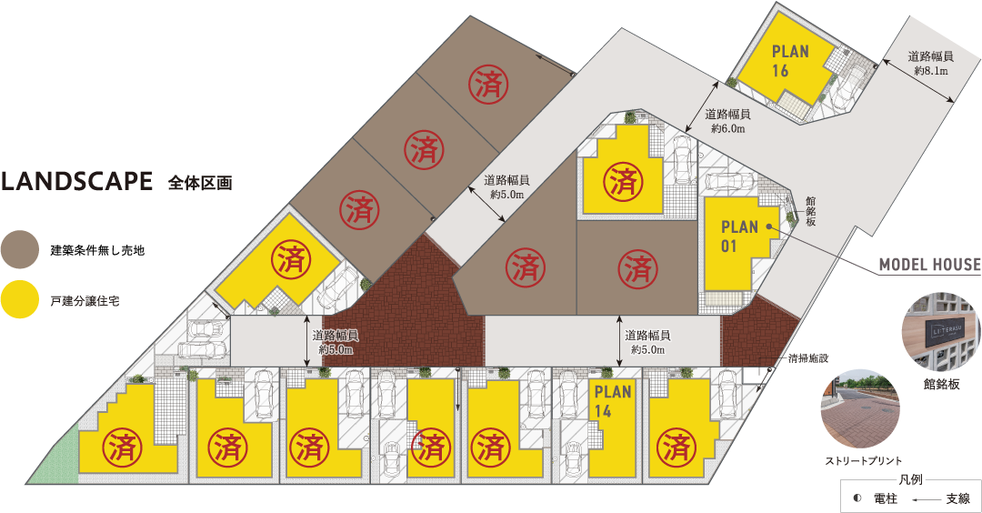 スタイリッシュなポール灯やスポットライトを配置。植栽や建物を美しく照らします。