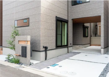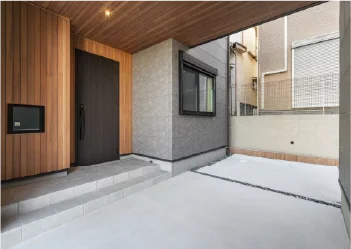 木目のアクセントが上質な印象を演出。雨や直射日光を遮り、天候を気にせず出入りできます。